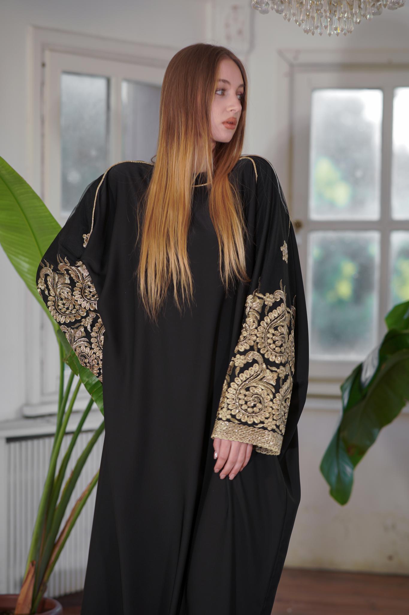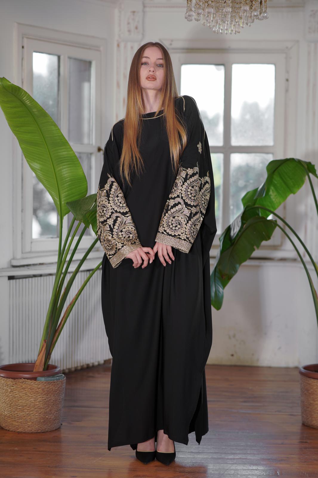 Kadın Siyah-Vizon Kolları Nakışlı Büyük Beden Oversize Salaş Uzun Abiye Elbise