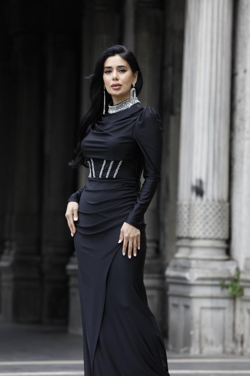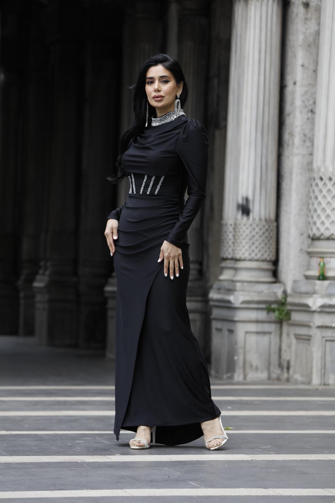 Siyah Gümüş Taş İşlemeli Yüksek Yakalı Uzun Elbise